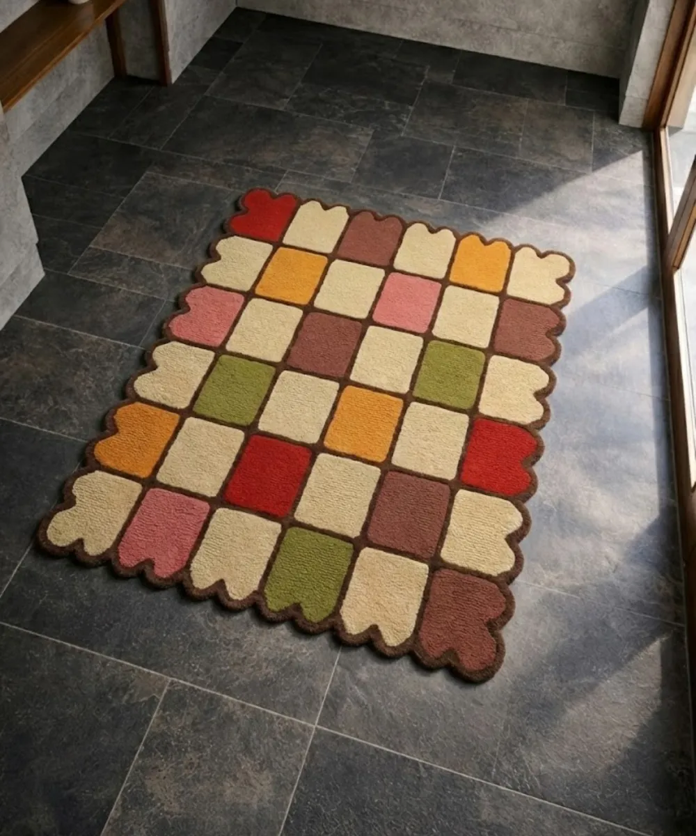 The Autumn Tile is a warm, expressive rug inspired by the rhythm of falling leaves and earthy transitions. Its checkered layout feels playful yet grounded, blending rust, olive, beige, and soft clay tones in a way that feels both nostalgic and modern. The scalloped edges soften the geometry, giving the modern rug a handcrafted charm that instantly warms up a space. This design works beautifully in living rooms, reading corners, and creative spaces that lean towards cozy, lived-in aesthetics.