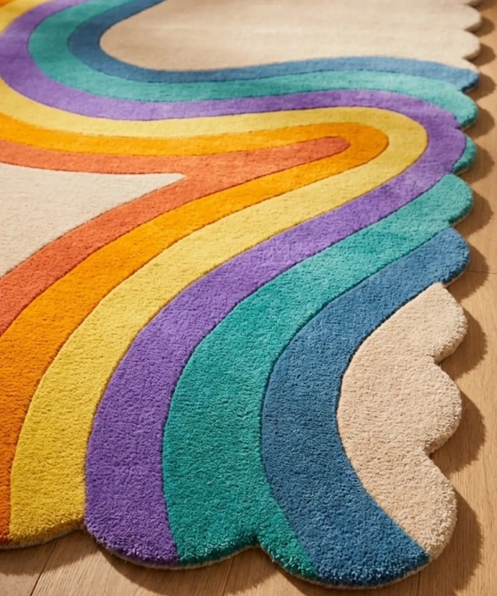 Chromatic Wave is a sculptural modern area rug that feels like an exclusive art piece. Broad, layered waves in premium tones move diagonally across an ivory base, creating depth and visual movement. The scalloped outline frames the composition softly, allowing bold color to feel intentional rather than overpowering.