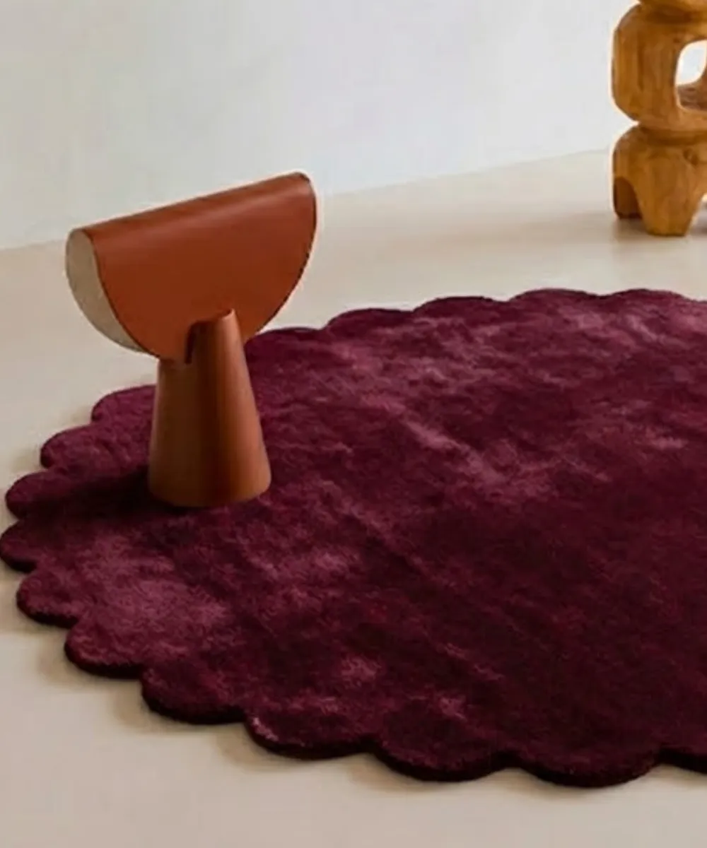 Crimson Aura round rug captures the elegance of deep wine tones and artistic curves. Its deep wine shade and scalloped round design add drama and sophistication to lounges, bedrooms, or prominent corners.