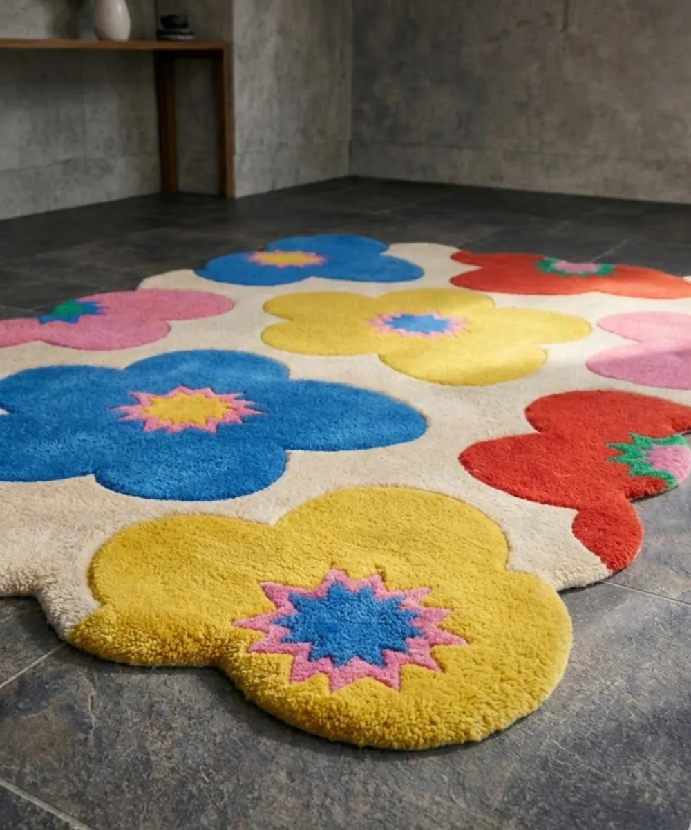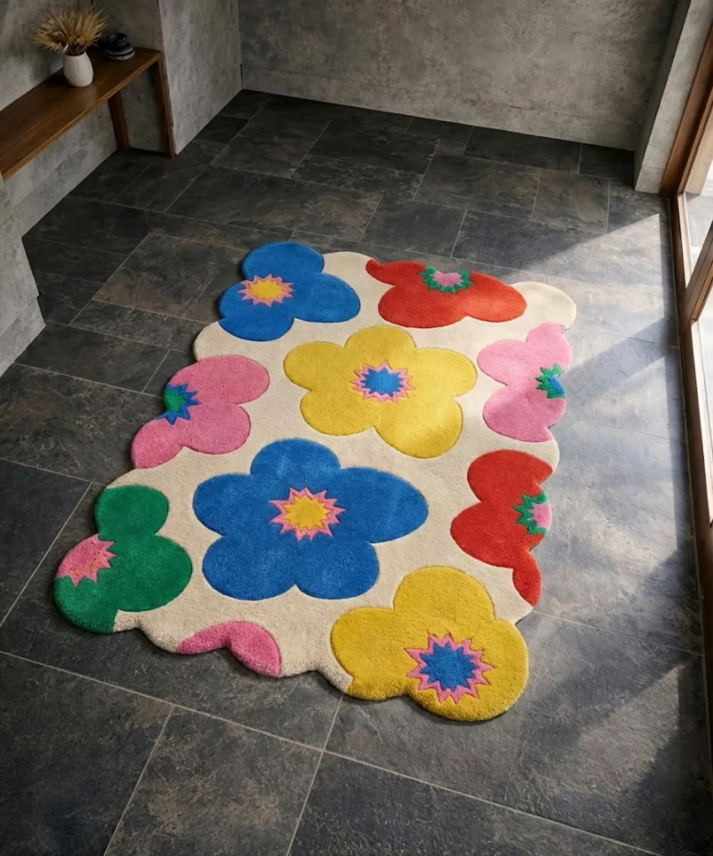 Vibrant and joyful, the Flora Fiesta rug features bold floral patterns in bright colors like blue, yellow, red, green, and pink. It celebrates color and movement. Inspired by festive flowers and playful art, this modern scalloped rug is hand-tufted from high-quality wool for durability, rich texture, and soft comfort. The sculpted edges frame the lively design nicely. Ideal for living rooms, creative spaces, or eclectic bedrooms, this floral rug can brighten up any interior. Pair it with neutral furniture to balance the colors, or mix it with bright accents for a more daring look. As a statement piece, Flora Fiesta is perfect for modern homes that embrace color, creativity, and handcrafted design.