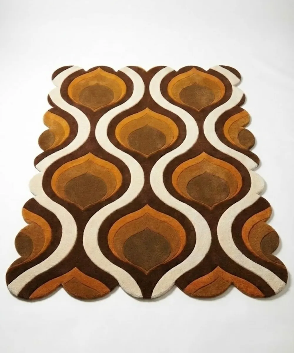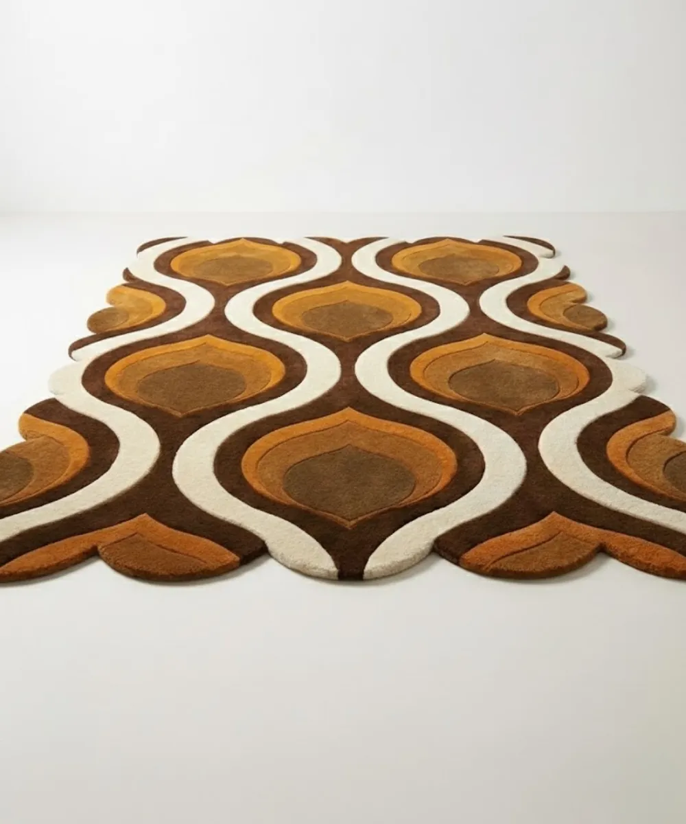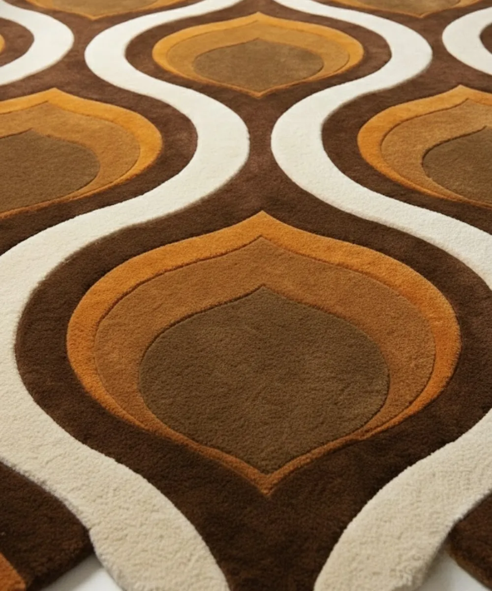 Fluid and inviting, the Honeyed Waves rug moves with a gentle retro rhythm. Curved, wave-like leafy designs in caramel and warm brown tones flow across a neutral base. This creates a sense of motion without overwhelming the space. The design feels nostalgic yet modern, reflecting contemporary influences with a softer touch.