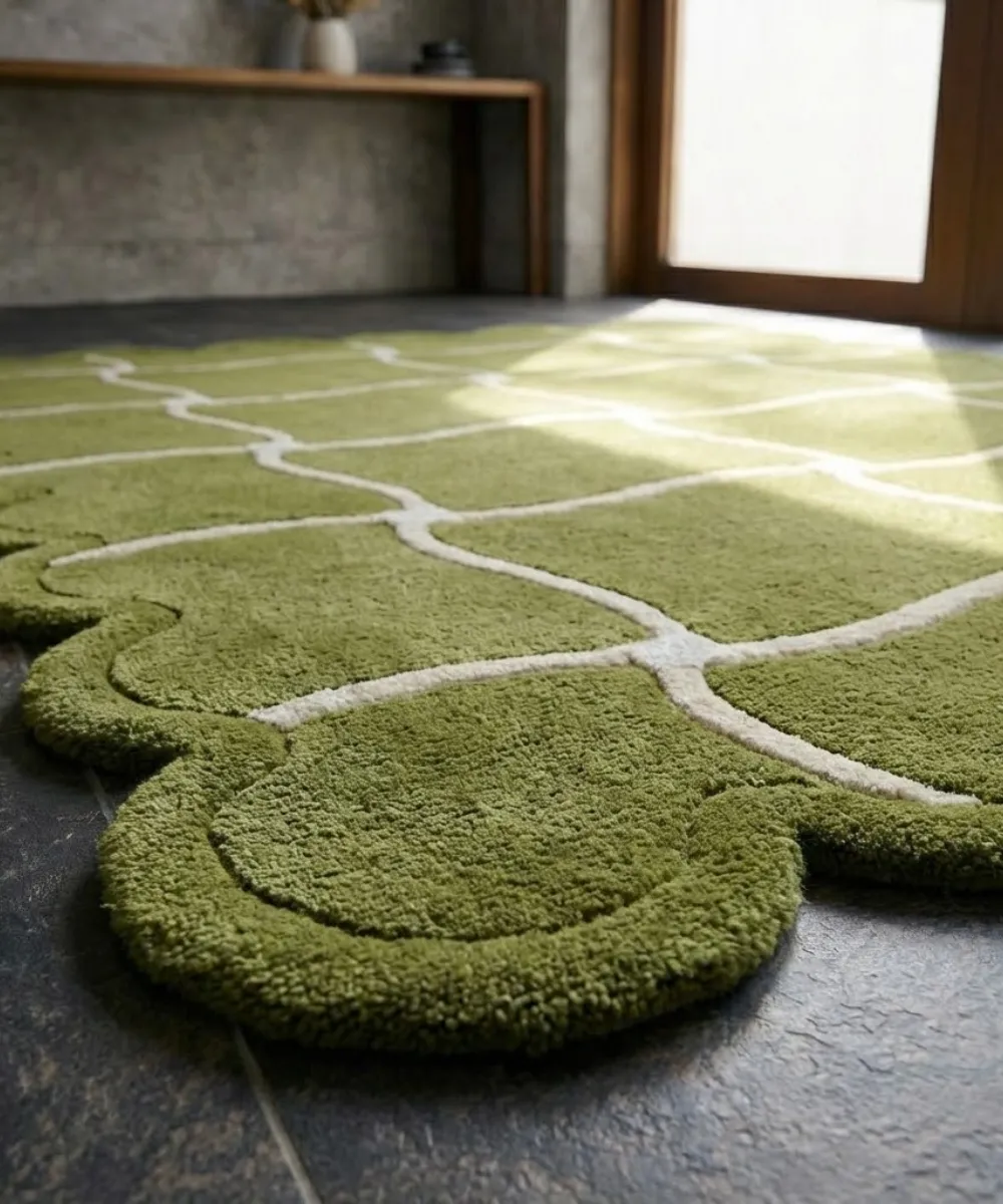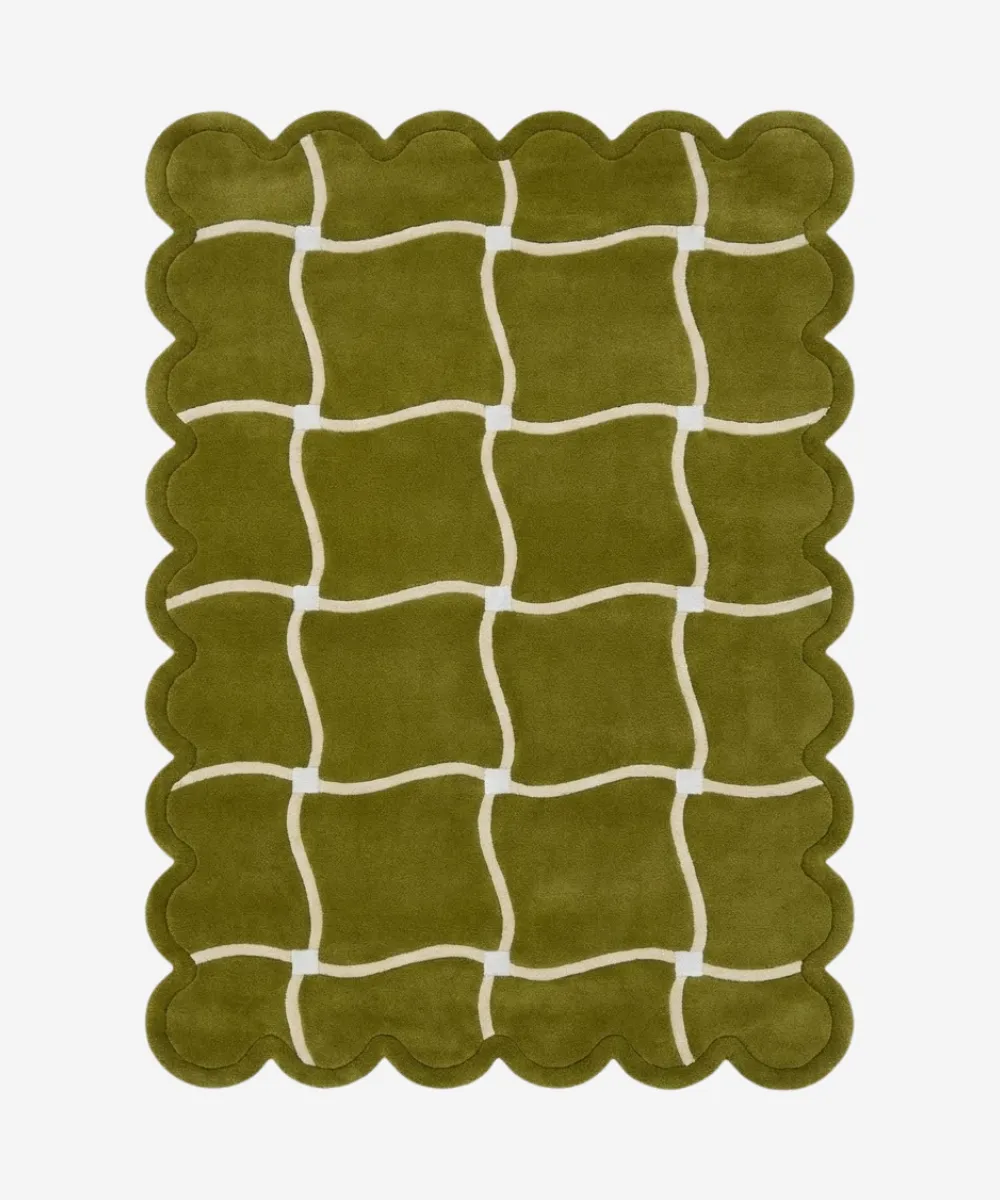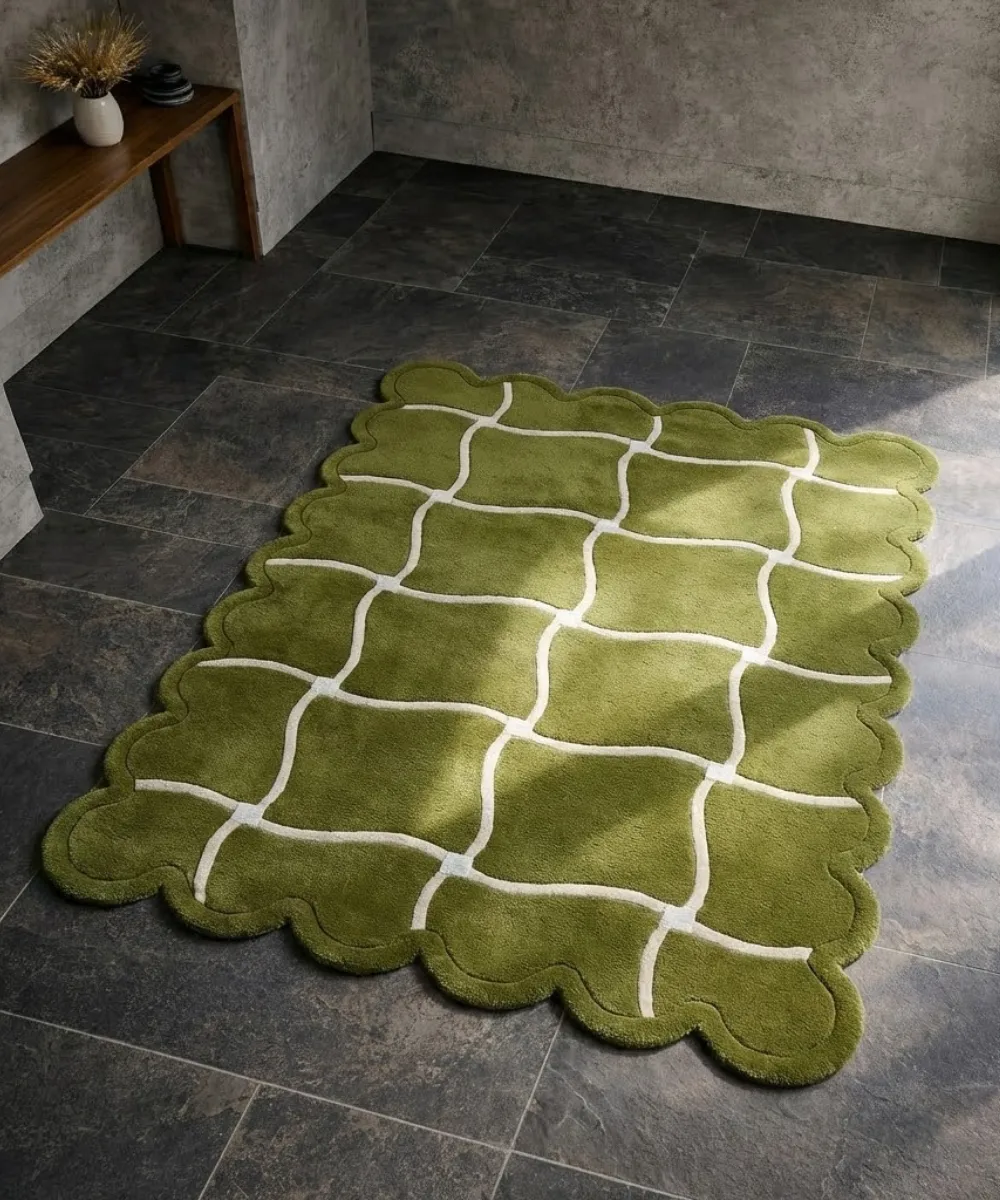 The Moss Weave Scalloped Rug brings an organic, hand-drawn feel into modern interiors. Featuring an irregular grid pattern in soothing green tones, this modern rug feels relaxed, natural, and thoughtfully designed, perfect for creating lived-in, welcoming spaces.