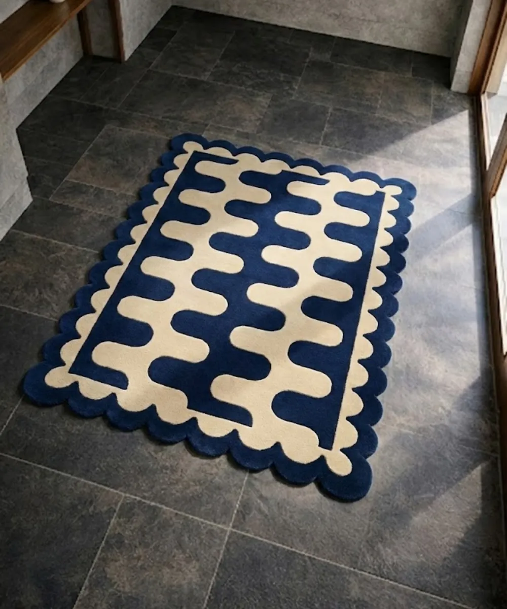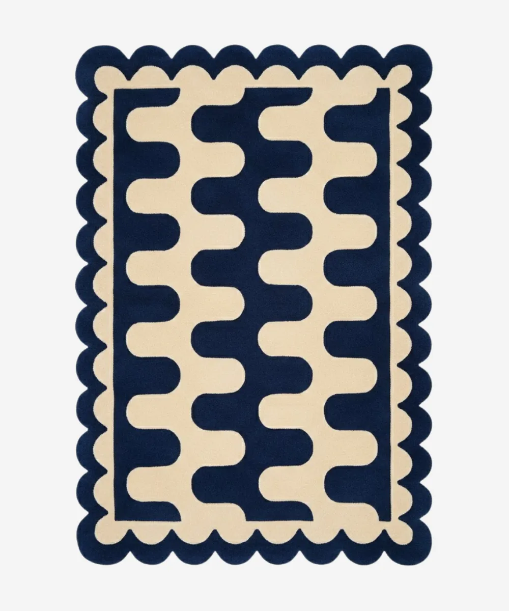 Custom sizing available on request. Explore modern geometric rugs with refined movement from Scalloped Rugs exclusive collection.
