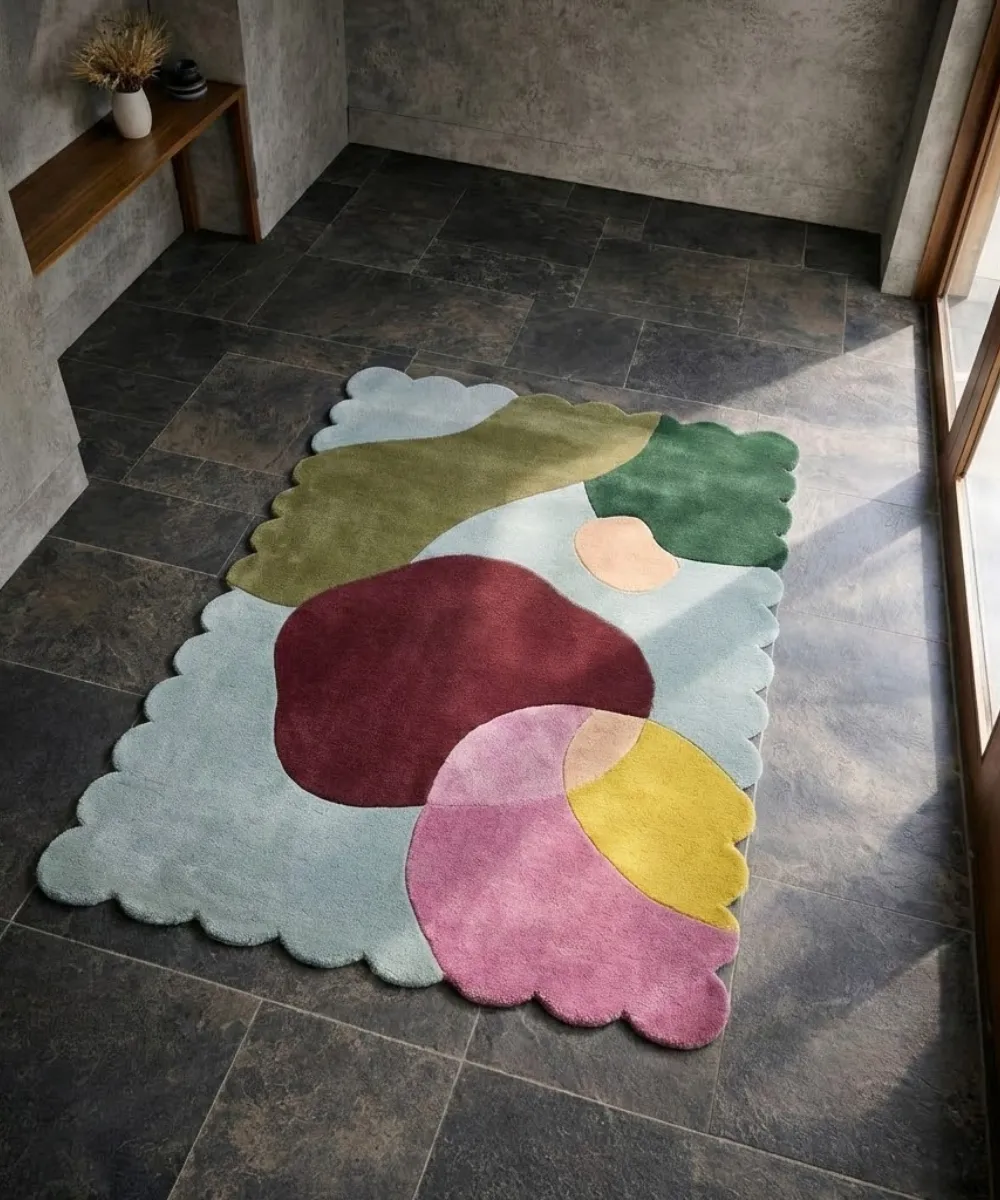 Custom sizes available on request. Explore abstract rugs inspired by natural harmony from Scalloped Rugs exclusive collection.