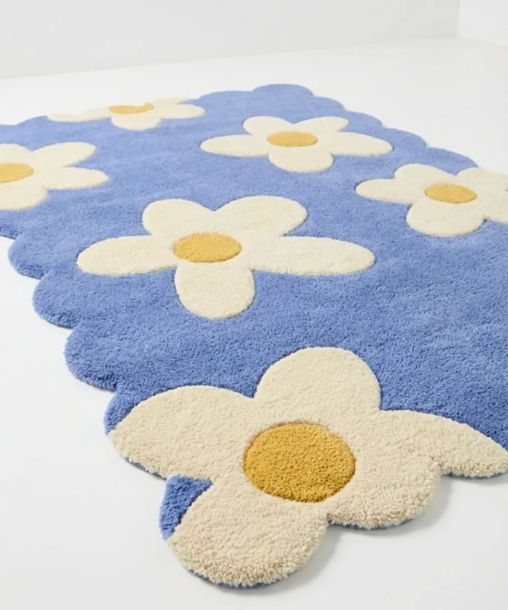 Fresh and uplifting, the Sea Tonic rug features large floral shapes in soothing ocean blue, creamy ivory, and soft yellow accents that remind one of breezy coastal mornings. Inspired by flowers near the sea and relaxed living, the design feels airy, calm, and inviting. Hand-tufted from high-quality wool, this scalloped floral rug offers plush comfort, exceptional durability, and a richly textured surface that retains its beauty over time. The rounded, scalloped edges add to its flowing, relaxed look. Perfect for living rooms, bedrooms, or casual seating areas, Sea Tonic brightens interiors without being overwhelming. Pair it with white walls, natural wood furniture, and light fabrics to create a coastal-inspired feel. Made for modern homes, this blue rug combines freshness, craftsmanship, and everyday comfort beautifully.