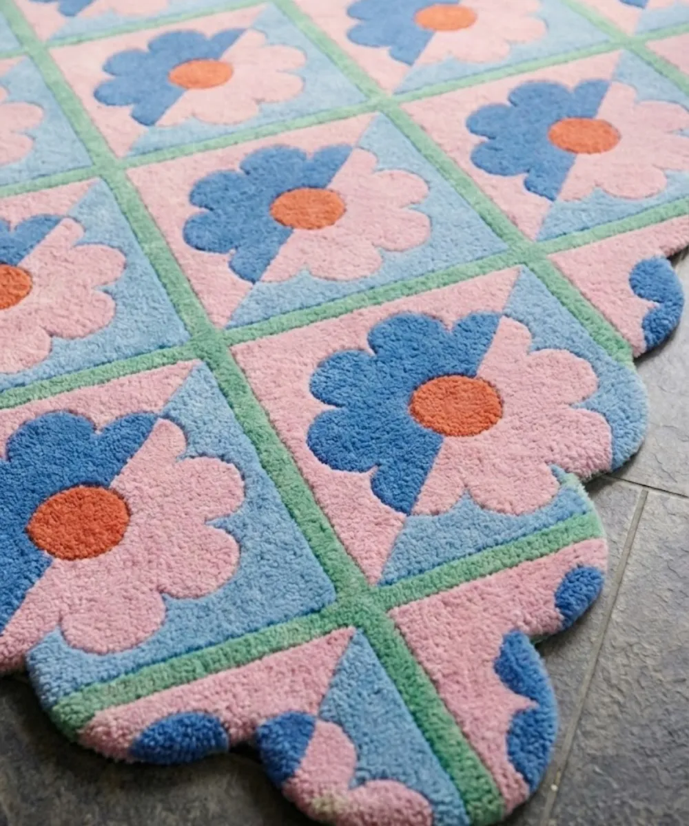 Charming and structured, the Sugar Trellis rug combines delicate floral patterns with a grid-inspired pattern, using soft pastels of blue, pink, mint, and warm accents. The design is inspired by garden look and vintage tilework, giving it a playful yet balanced feel. This scalloped floral rug is hand-tufted from high-quality wool and provides plush comfort, lasting durability, and a richly textured surface. The carved pile highlights each design, while the scalloped edges soften the structured layout. Ideal for bedrooms, nurseries, or relaxed living spaces, Sugar Trellis adds gentle color and elevated structure to the room. Pair it with light wood furniture, pastel decor, or neutral textiles to keep an airy feel. Made for modern homes, this floral area rug offers timeless charm with handcrafted quality.